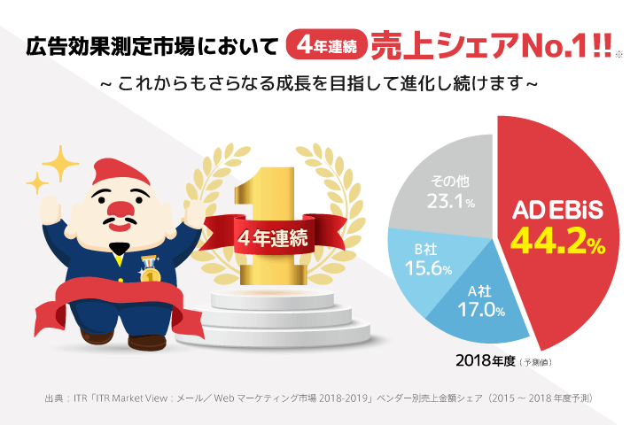 ITRの2018年度予測によれば、国内広告効果測定市場は前年度比8.1%増の堅調な伸びとなっており、中でもトップベンダーである当社は、市場の成長を上回る 13.0%増を記録。前年度比で最もシェアを伸ばし、国内の広告効果測定市場をけん引しているとしています。