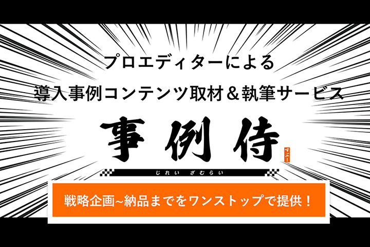 「事例侍」は、①事前戦略会議、 ②プロット構築、 ③インタビュー、④原稿執筆・校正、⑤原稿確認を経て、完成原稿納品までの一連のプロセスを一気通貫で提供するコンテンツ制作サービスです。2000年の創業から20年以上にわたり企業・団体等のオウンドメディア(Web、SNS、紙の雑誌等)の制作サービスを提供してきたノウハウとプロのエディターのスキルを活かし、事実とドラマを感じさせるストーリーの両面から訴求力のある品質の高いコンテンツを制作し、提供します。