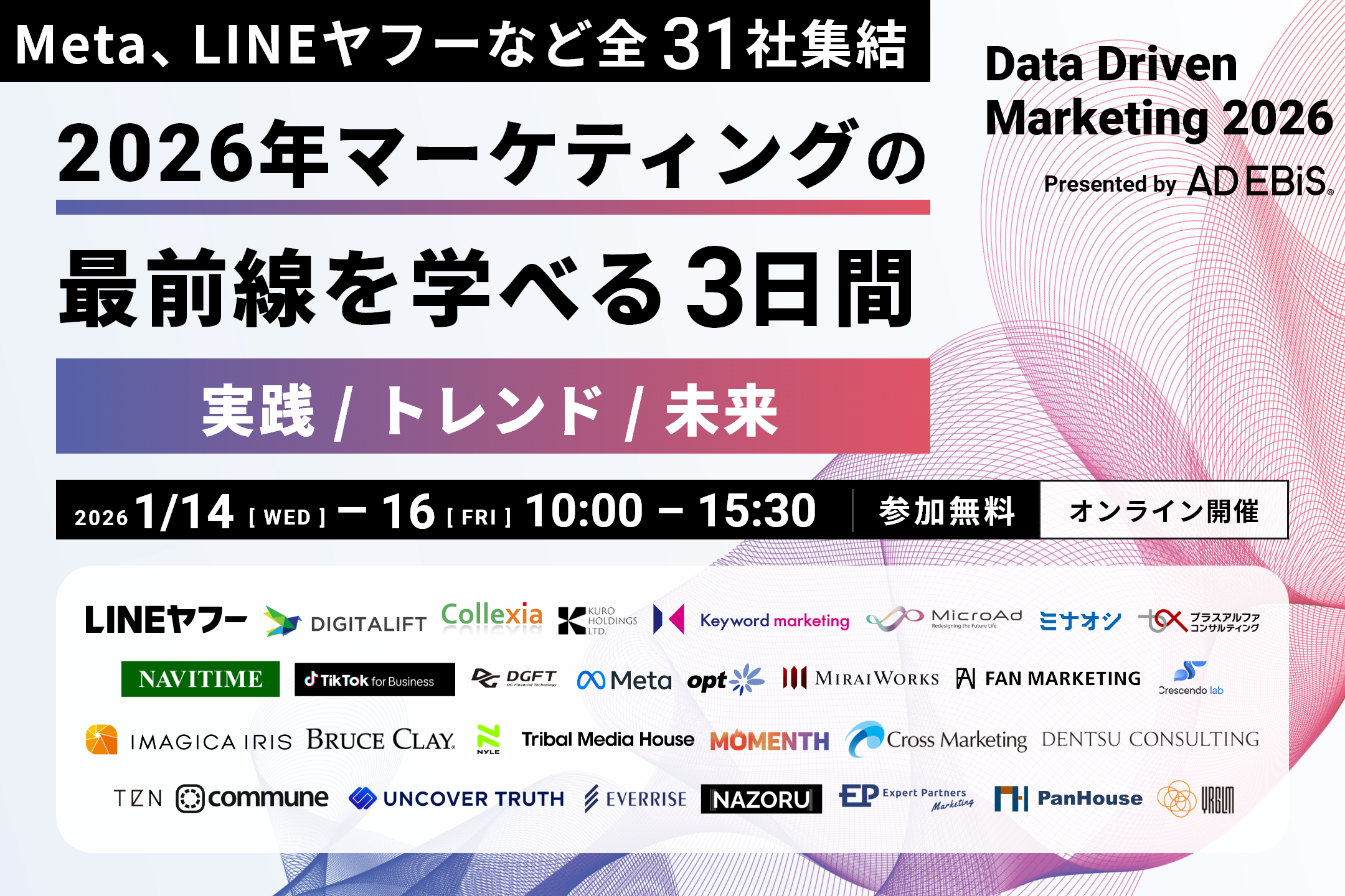 アドエビス、マーケティングの最前線を“実践者のリアルな声”で深掘るオンラインカンファレンス「Data Driven Marketing 2026」を1月14日(水)~16日(金)に開催 ~ Meta、LINEヤフー、TikTok for Businessなど全31社登壇~