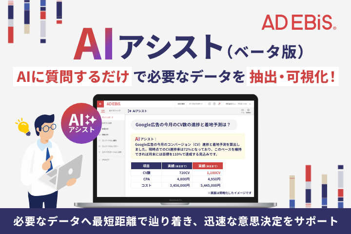 アドエビス、AIに質問するだけで必要なデータを抽出・可視化する「AIアシスト(ベータ版)」を提供開始。~「管理画面上の操作」をAIが代替し、データ活用を支援~