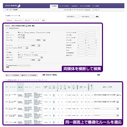 これまで両媒体で、あるキーワードに対して同じ運用ルールを適応する際には、それぞれの管理画面で同じような操作を繰り返し行う必要がありましたが、AutoBidを利用すれば、今回のバージョンアップにより、こうした重複作業を同一画面で一度に行うことが可能になり、よりシームレスで効率的なリスティング運用を実現することが可能になります。