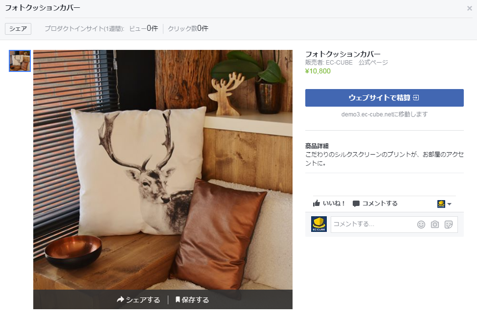 ●FacebookページのショップセクションにEC-CUBEの商品を連携し紹介することができます。商品詳細画面からの遷移もスムーズで、ユーザーはシームレスに商品を購入することが可能です。