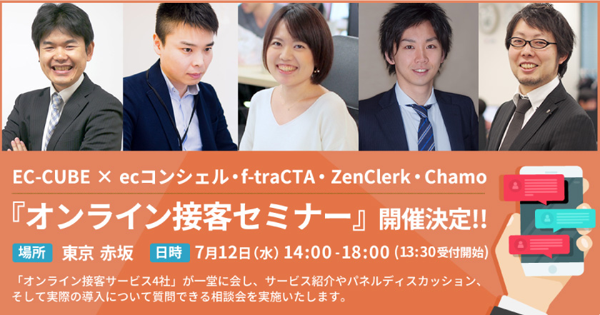 EC-CUBEでは、店舗の売上アップ支援のため、「オンライン接客サービス」との連携を積極的に進めており、現在では既に主要3社 ecコンシェル(株式会社NTTドコモ)、ZenClerk(Emotion Intelligence株式会社)、Chamo(株式会社チャモ) との連携が完了している他、今後は更にf-traCTA(株式会社エフ・コード)を始め、複数のサービスとの連携を予定しています。また、国内では初となる「オンライン接客サービス4社」が一堂に会してサービス紹介・パネルディスカッションを行うセミナーの実施や、特設サイトの新設など、サービスの導入支援により更なる連携強化を目指しています。