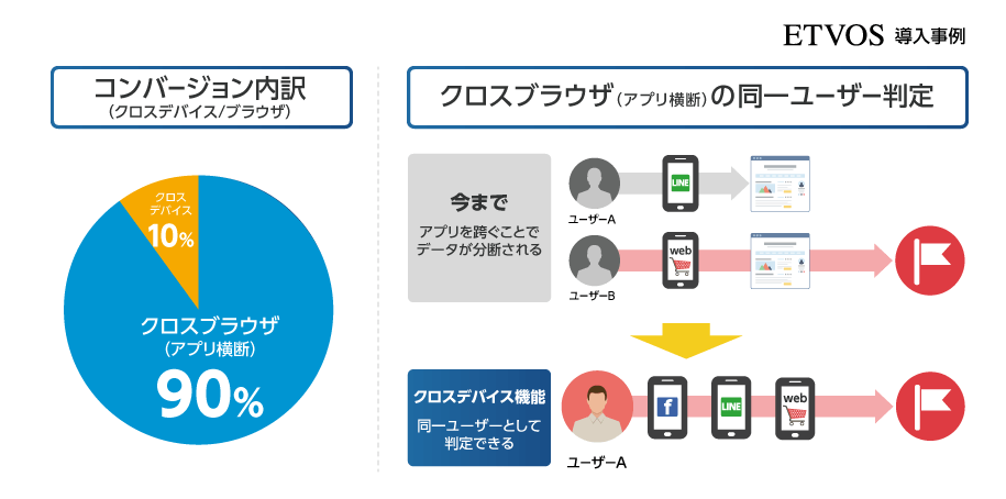 クロスデバイスやクロスブラウザによって発生したコンバージョンの約9割が、クロスブラウザ(アプリ横断)によるものであることが判明しました。エトヴォス様では積極的にスマートフォンマーケティングを実施していることから、SNSやブラウザなど複数のアプリでの接触がコンバージョンに影響していることがわかりました。