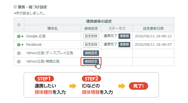 本リリースでは、ヤフー株式会社が提供する広告・サービスのリニューアルに伴い、新たにYahoo!広告と連携を行いました。これにより、すでに連携済みのGoogle広告をはじめ、計6媒体の広告データの自動取得が可能となります。