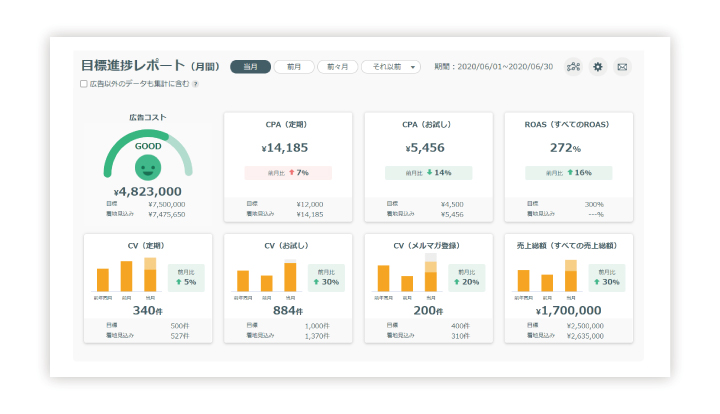 自動取得した各種広告データはダッシュボードに反映され、これまでデータの集計や加工にかかっていた時間を大幅に短縮するだけでなく、視覚化による迅速な現状把握を後押しします。ダッシュボードでは、CPAやROASといった主要指標の進捗状況をはじめ、コストの消化状況や月末時点の着地見込みなど、広告の成果判断に必要な各種情報を確認することができます。