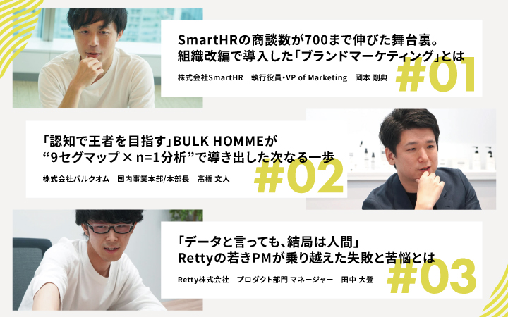 失敗や苦労も含めたリアルな実体験を通して、同じ悩みを抱えるマーケターに課題解決の糸口となる内容を発信していく予定です。第一弾は、SmartHR岡本氏、バルクオム高橋氏、Retty田中氏のインタビューを掲載しています。