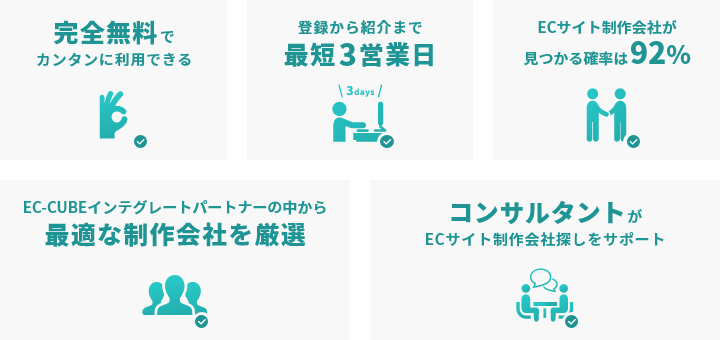 140社を超えるEC-CUBEのインテグレートパートナーの中からサイト構築経験豊富なECサイト制作会社を中心に広告主企業の条件に合う制作会社をご紹介することにより、広告主企業は費用と時間をかけることなく経験豊富なECサイト制作会社を見つけることが可能となります。
