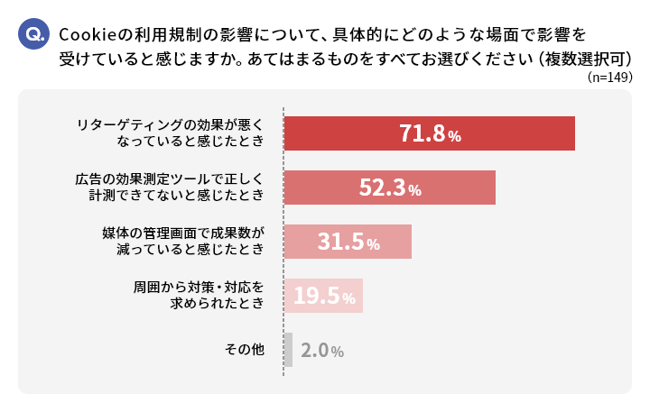 具体的に影響を受けている場面(複数回答)としては、「リターゲティングの効果が悪くなっていると感じたとき」(71.8%)、「広告の効果計測ツールで正しく計測できてないと感じたとき」(52.3%)、「媒体の管理画面で成果数が減っていると感じたとき」(31.5%)、「周囲から対策・対応を求められたとき」(19.5%)などが挙げられました。主にWeb広告の効果測定において影響を実感していることがうかがえました。