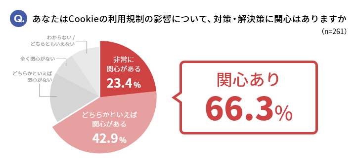 「影響についての対策・解決策に関心はありますか」という質問には、66.3%が「非常に関心がある」または「どちらかといえば関心がある」と回答し、Cookie利用規制対策への関心の高さが表れる結果となりました。