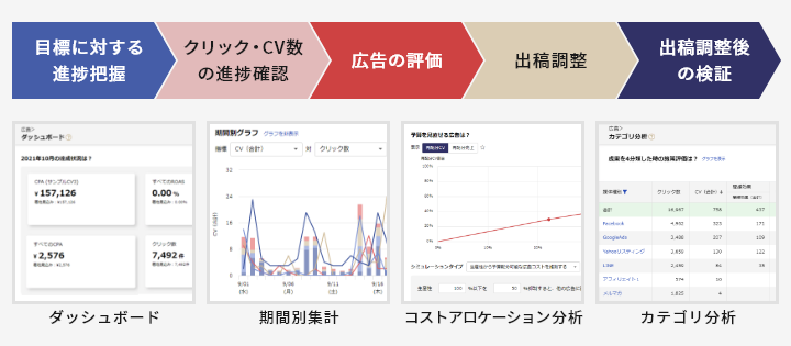 Webマーケティング施策の成果最大化につながる運用を行ううえで大切な「進捗状況の確認」や「改善ポイントの発見」など、目的に応じたデータ把握が簡単にできる各分析画面をご利用いただけます。